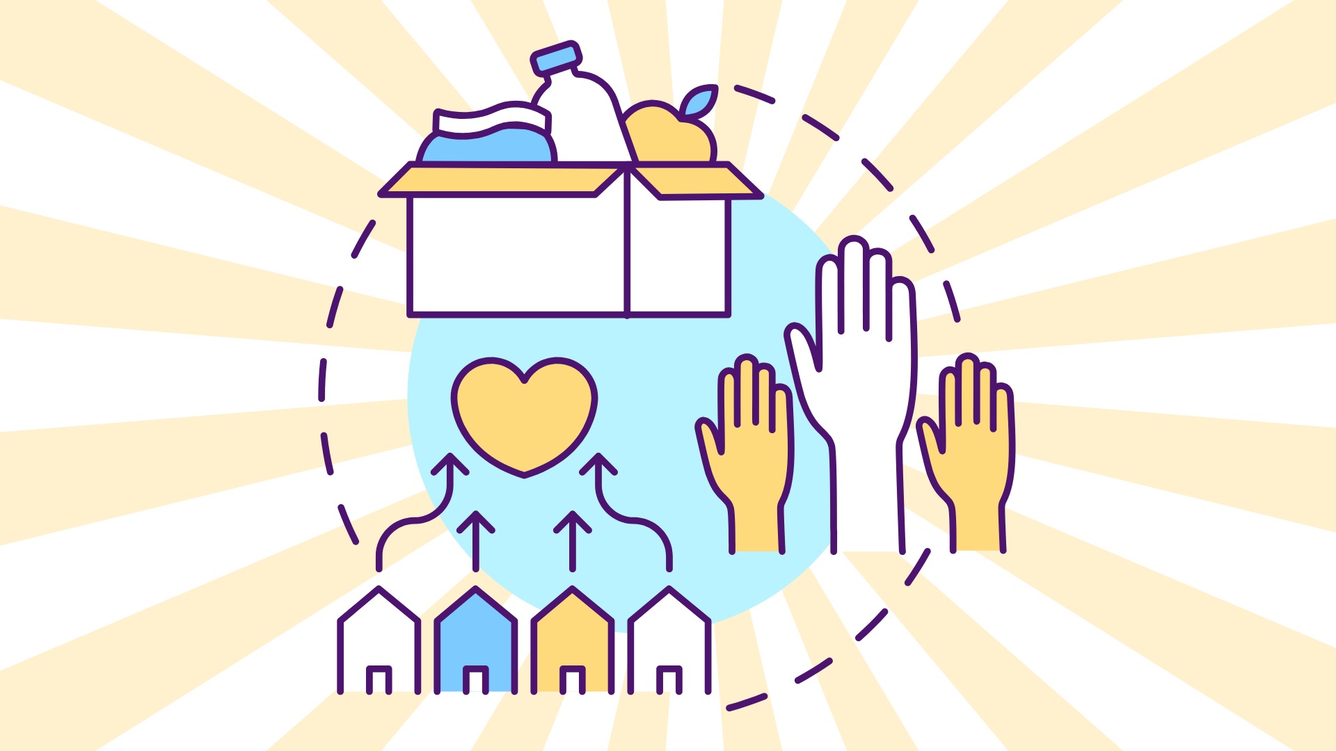 Abstract image depicting helping hands, love, and a box of needed goods.