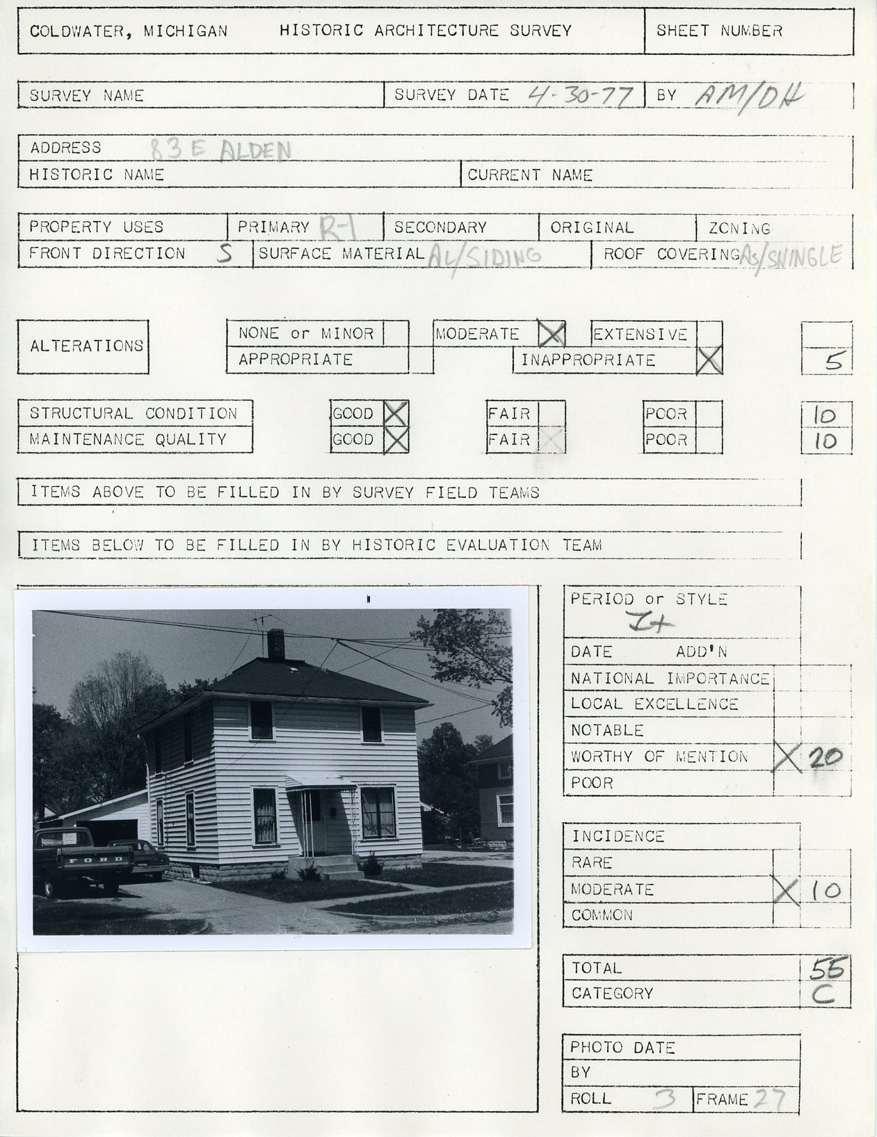Architectural survey of 83 E. Alden in Coldwater, Michigan conducted on April 30, 1977.