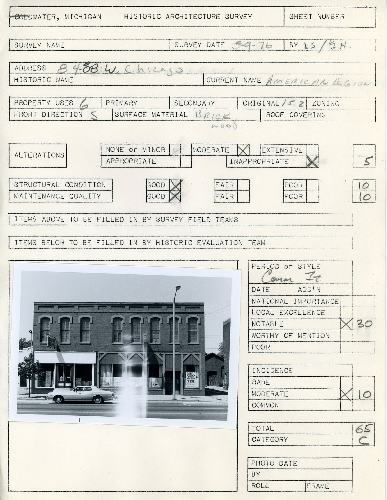 Architectural survey of the American Legion at 84-88 W. Chicago in Coldwater, Michigan conducted on May 9, 1976.
