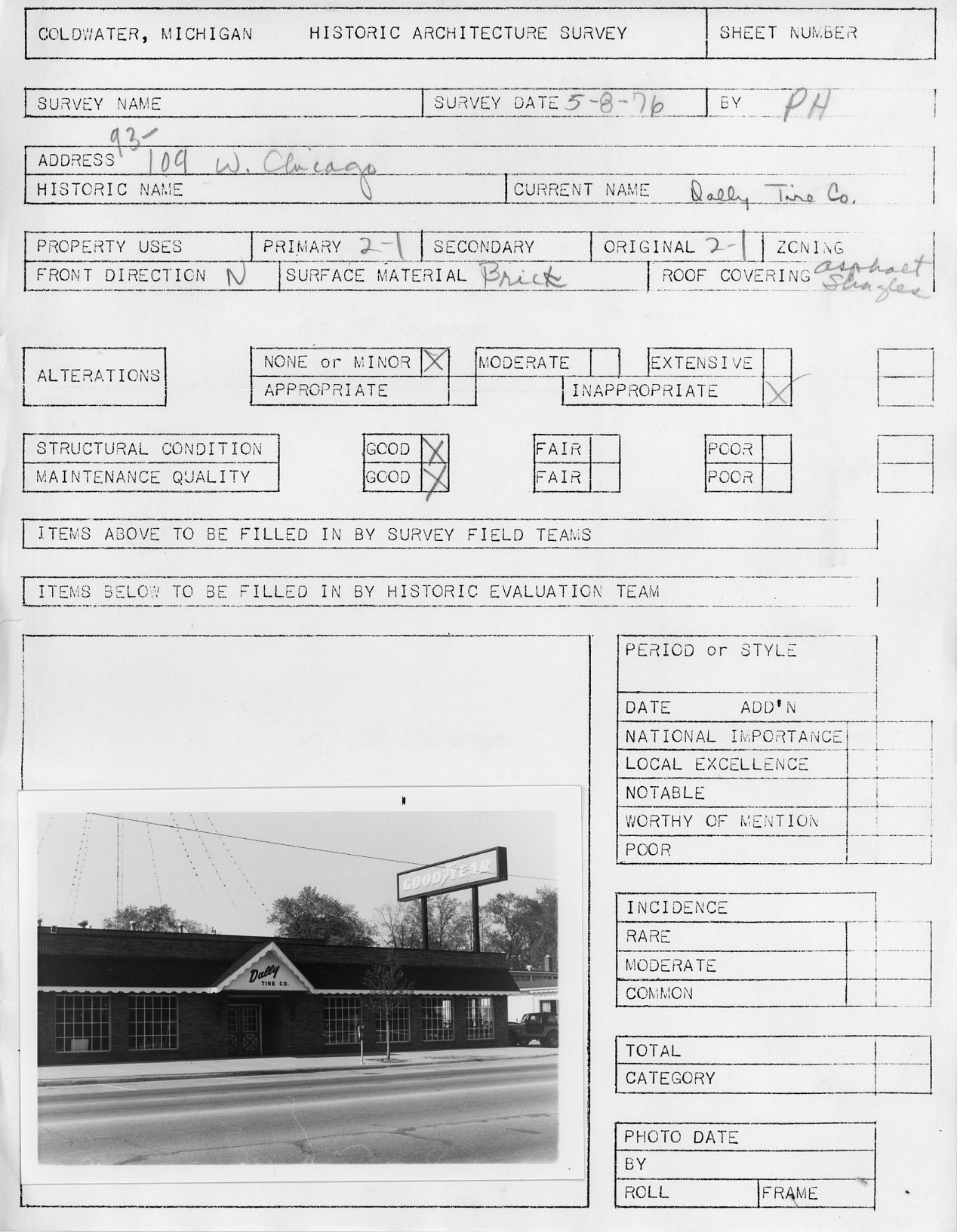 Architectural survey of Dally Tire Co. at 93-109 W. Chicago in Coldwater, Michigan conducted on May 8, 1976.