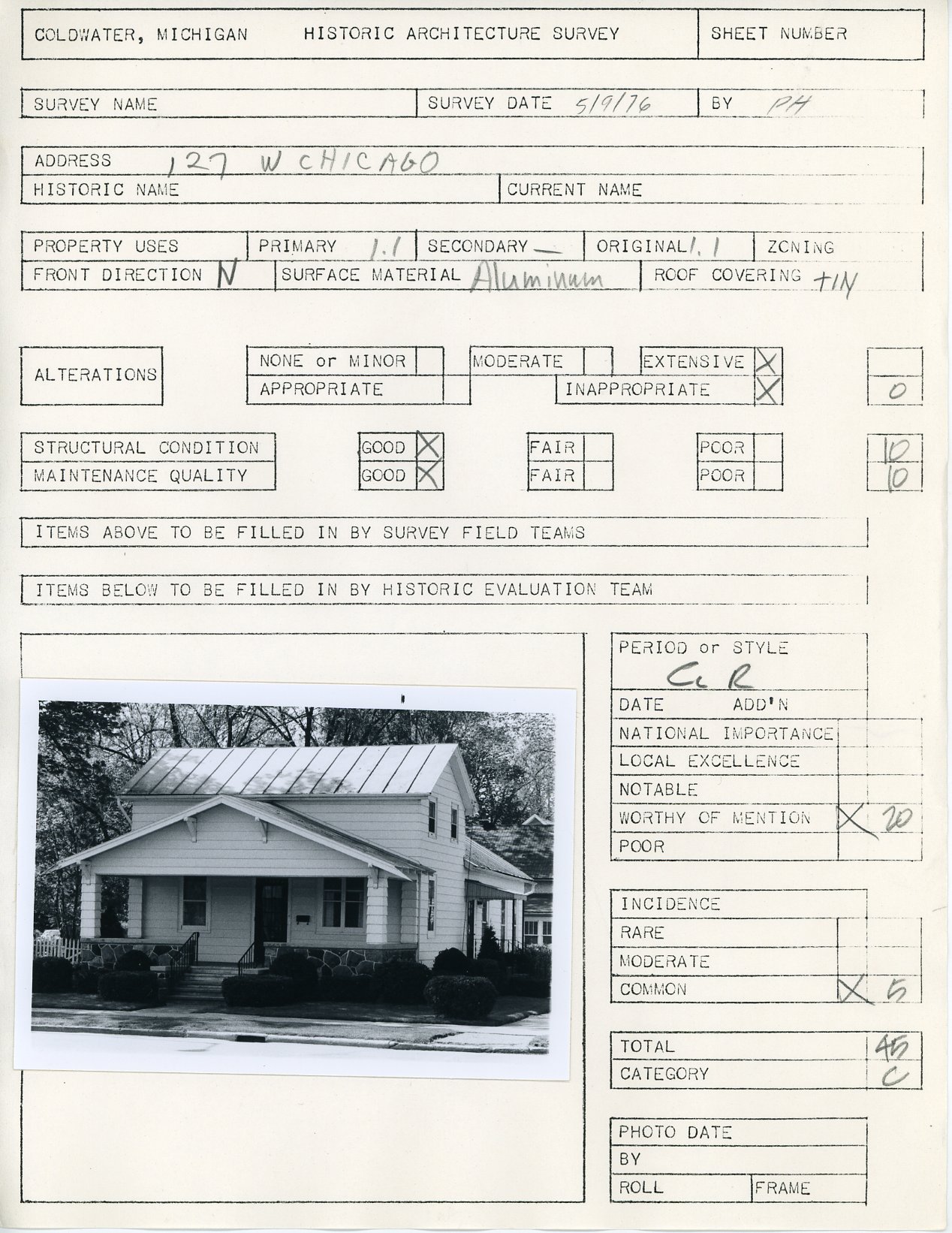 Architectural survey of 127 W. Chicago in Coldwater, Michigan conducted on May 9, 1976.