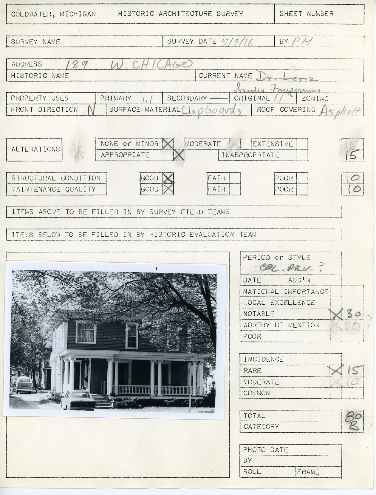 Architectural survey of 189 W. Chicago in Coldwater, Michigan conducted on May 9, 1976.