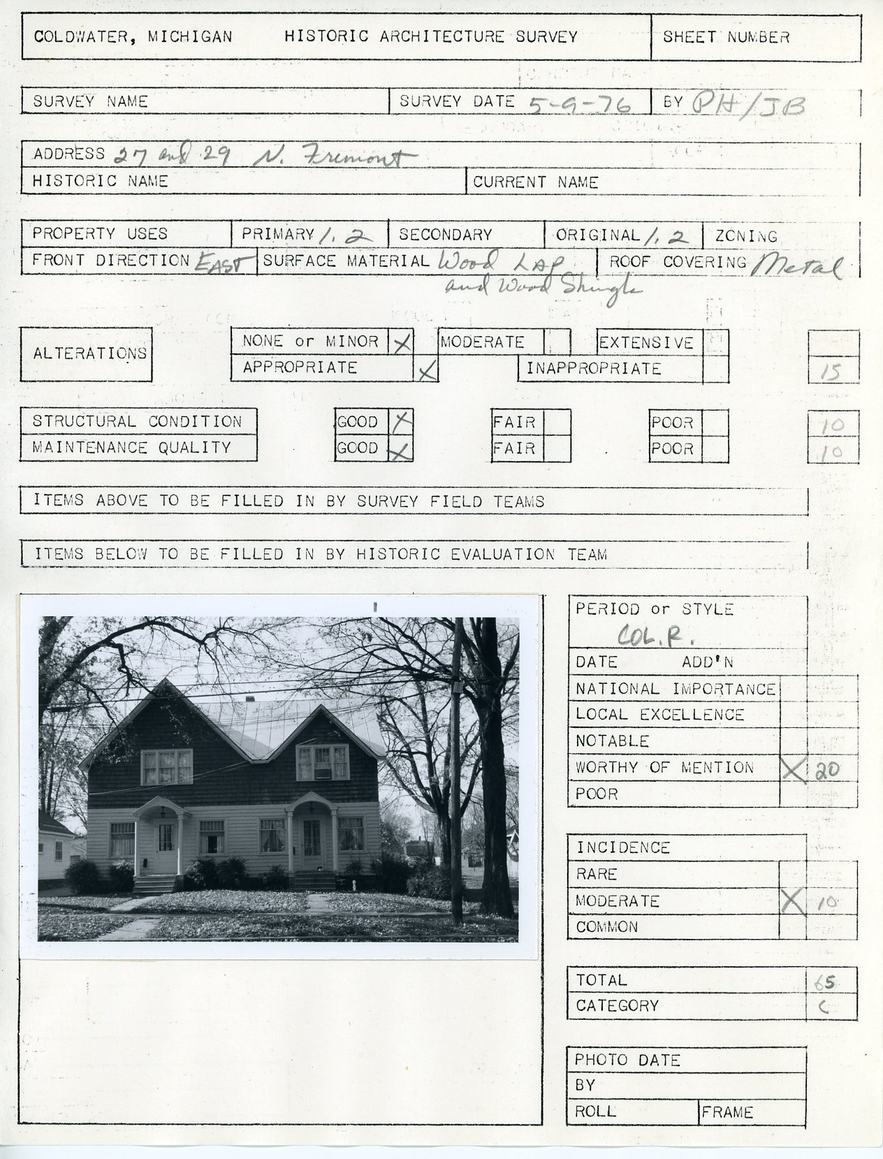 Architectural survey of 27-29 N. Fremont in Coldwater, Michigan conducted on May 9, 1976.