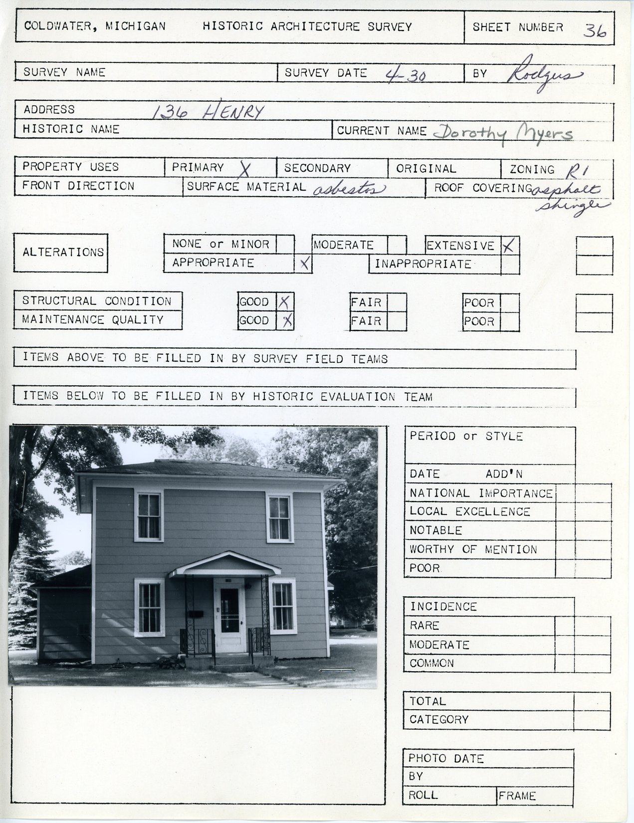 Architectural survey of 136 Henry in Coldwater, Michigan conducted between 1976 and 1979.