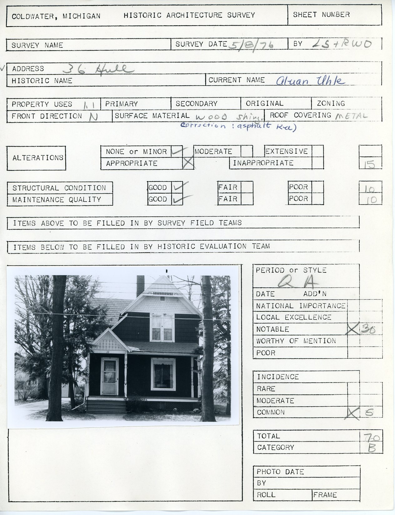Architectural survey of 36 Hull in Coldwater, Michigan conducted on May 8, 1976.
