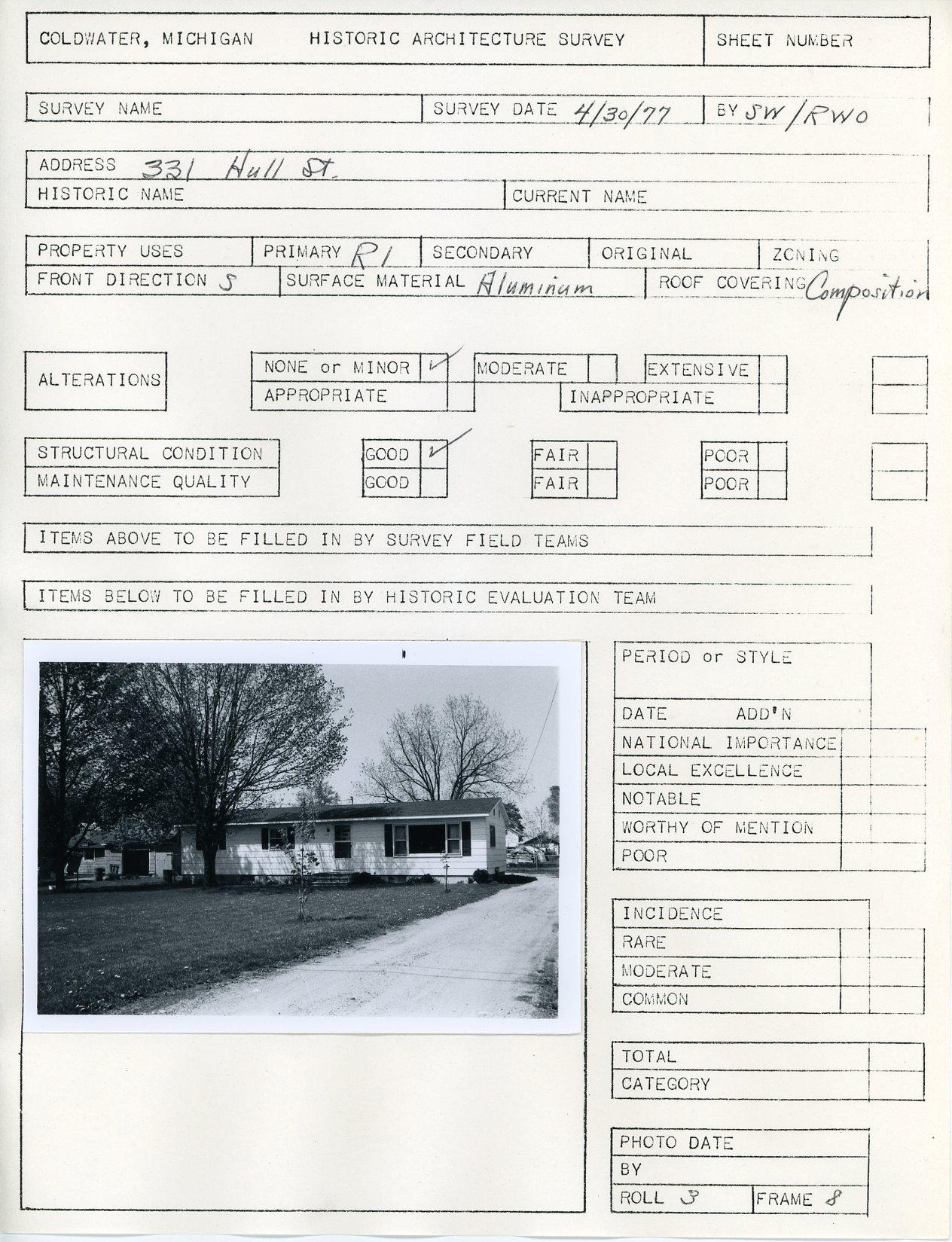 Architectural survey of 331 Hull in Coldwater, Michigan conducted on April 30, 1977.