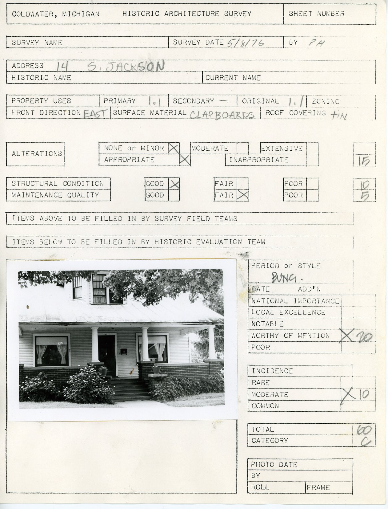 Architectural survey of 14 S. Jackson in Coldwater, Michigan conducted on May 8, 1976.