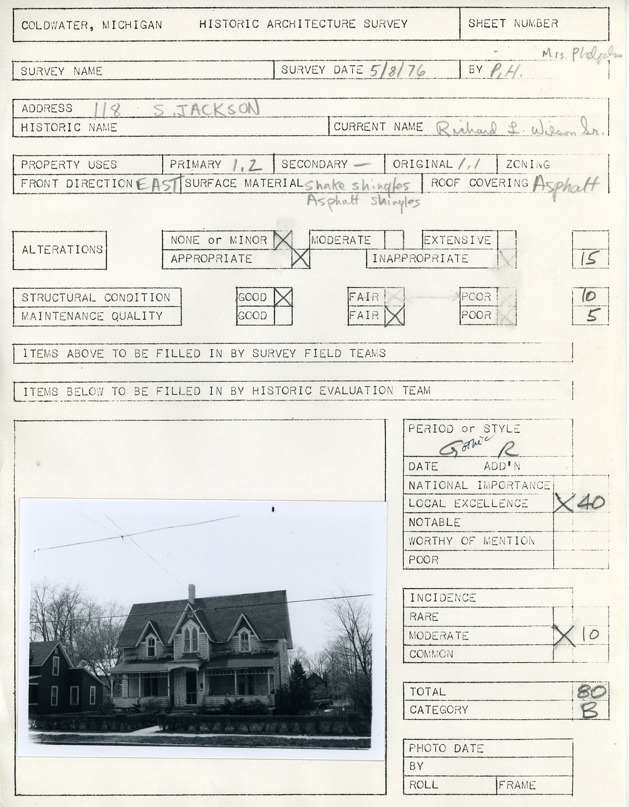 Architectural survey of 118 S. Jackson in Coldwater, Michigan conducted on May 8, 1976.