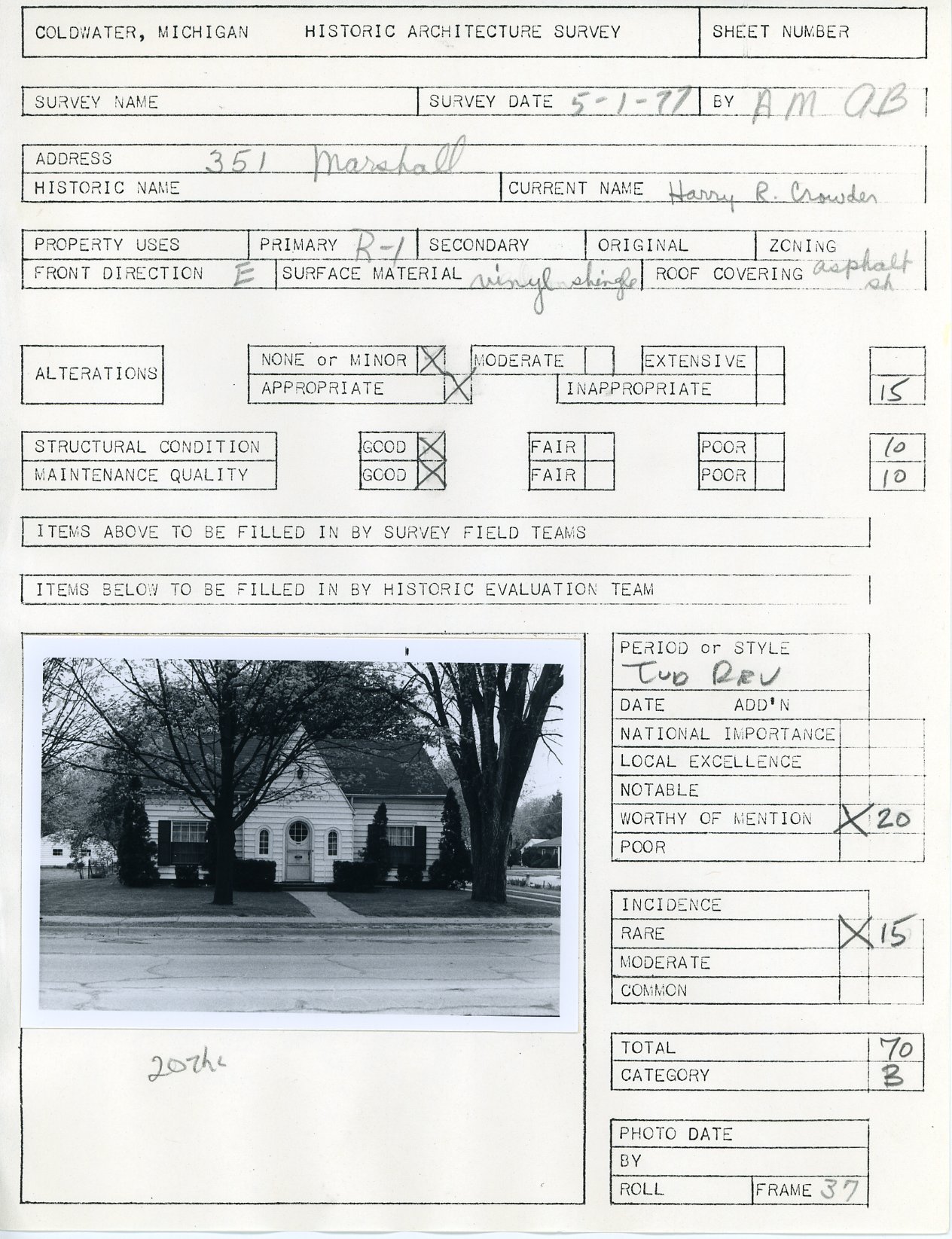 Architectural survey of 351 Marshall in Coldwater, Michigan conducted on May 1, 1977.