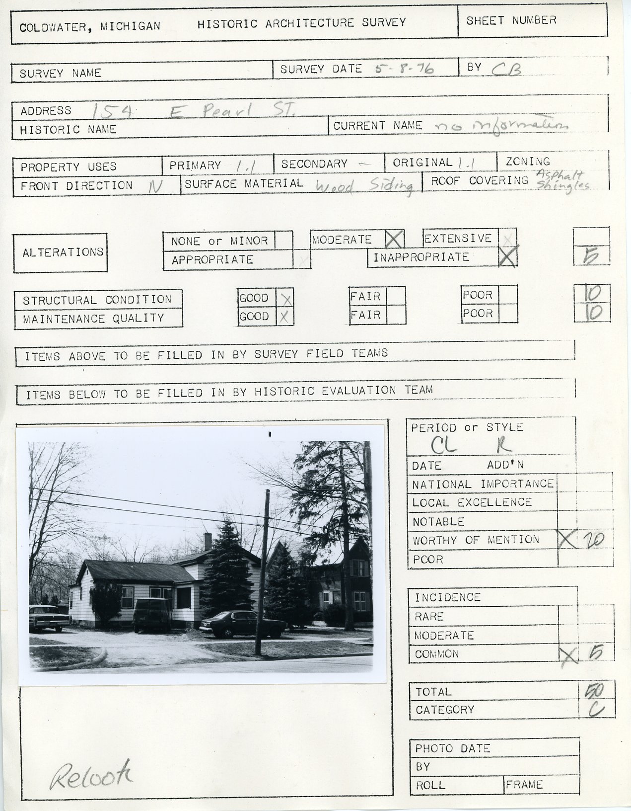 Architectural survey of 154 E. Pearl in Coldwater, Michigan conducted on May 8, 1976.
