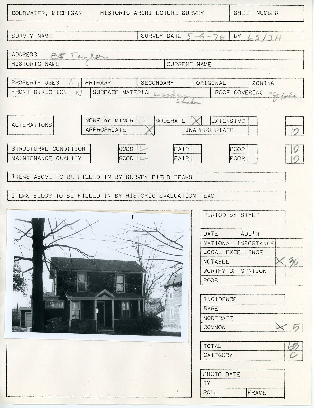 Architectural survey of 85 Taylor in Coldwater, Michigan conducted on May 9, 1976.