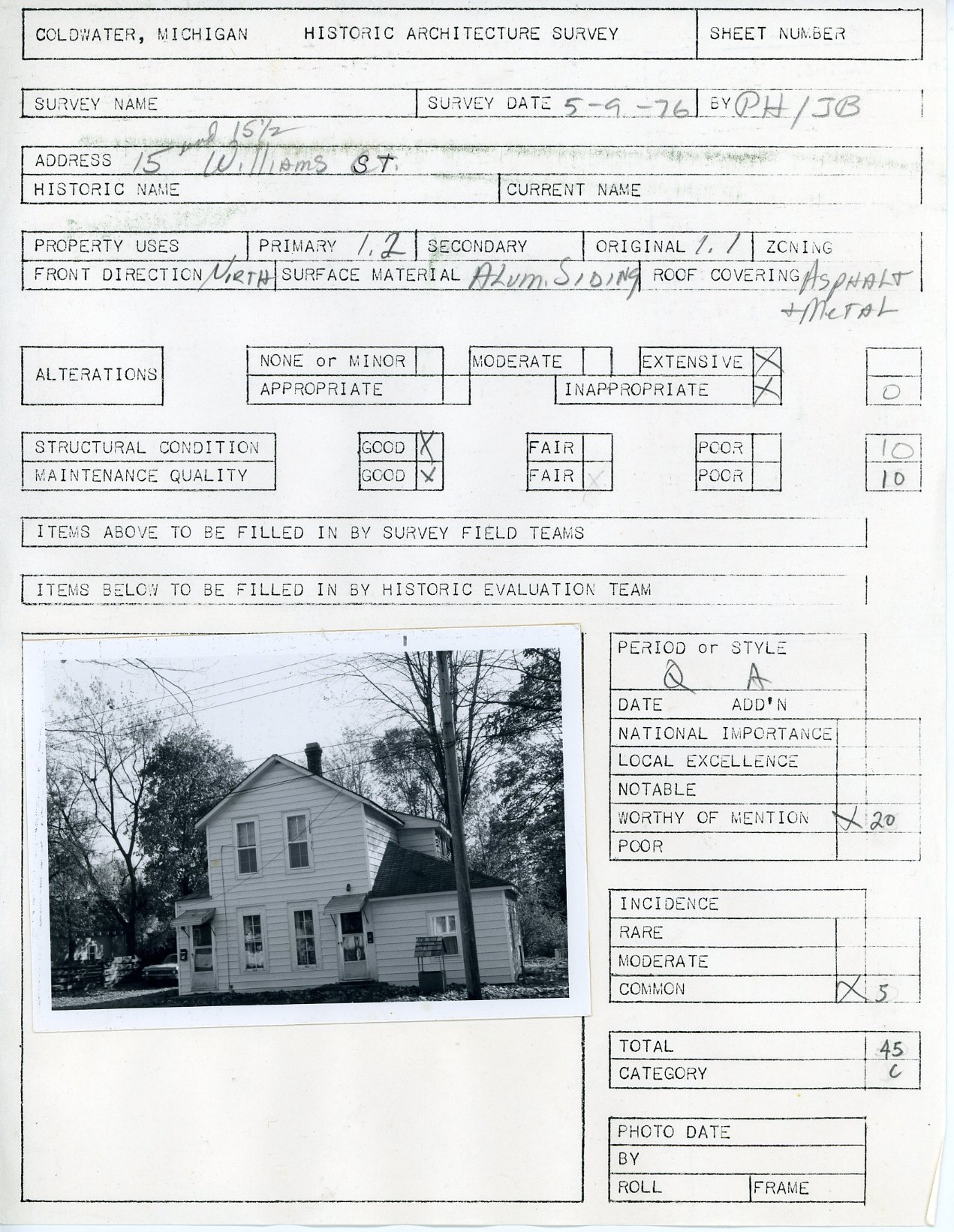 Architectural survey of 15-15 1/2 Williams in Coldwater, Michigan conducted on May 9, 1976.